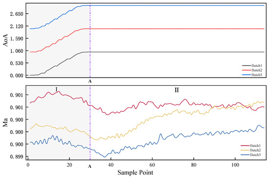 Therefore, based on the variation in the AoA during the experiment, a complete test batch is divided into two stages. The specific division criteria are shown in Equation (4), where is the target AoA, represents the instantaneous AoA at time t, and is the allowable error threshold: