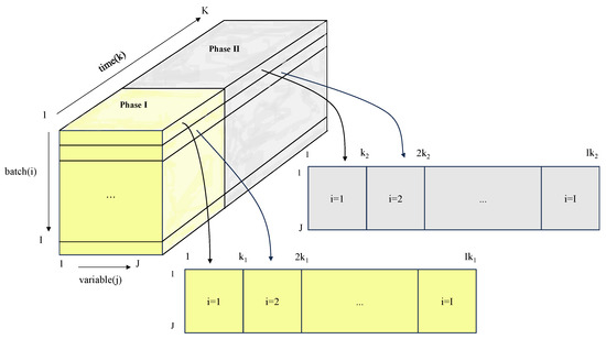 High-dimensional data variables are a characteristic of wind tunnel testing, as multiple test batches exist for experiments in the same mode. Denote the experimental data of I batches under a specific mode as , which constitutes three-dimensional data. Direct modeling is infeasible, necessitating conversion into two-dimensional data prior to analysis. Formally, G is expressed as a third-order tensor [38], where I denotes the number of batch variables, K represents the number of sampling generations, and J corresponds to the number of selected variables.