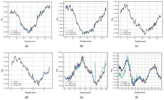 Comparison of prediction performance between single-mode and multi-mode predictive models: (a) operating condition 1, (b) operating condition 2, (c) operating condition 3, (d) operating condition 4, (e) operating condition 12, and (f) operating condition 13.