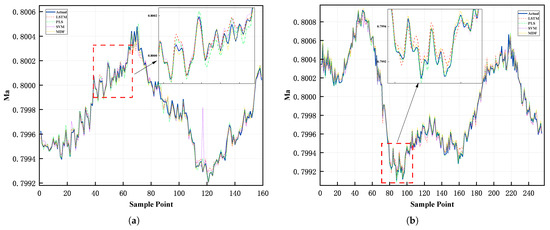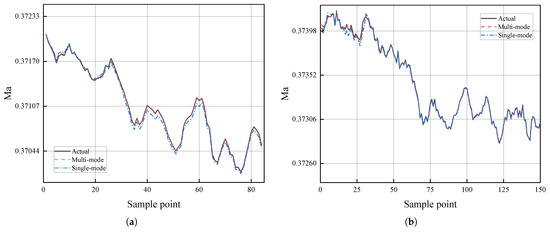 The multi-mode prediction model also adopted a 7:3 training–test split ratio. Comparative analysis between single-mode and multi-mode prediction models was performed for six operating conditions in Modes 1 and 3. As illustrated in Figure 6, actual Mach number curves, single-mode predictions, and multi-mode predictions are visually compared for these six conditions.