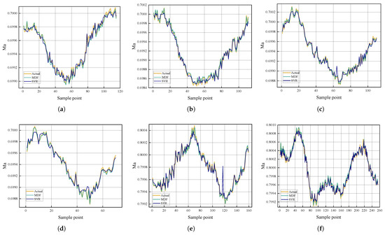 Comparison of prediction performance between MDF and SVR: (a) operating condition 1, (b) operating condition 2, (c) operating condition 3, (d) operating condition 4, (e) operating condition 12, and (f) operating condition 13.
