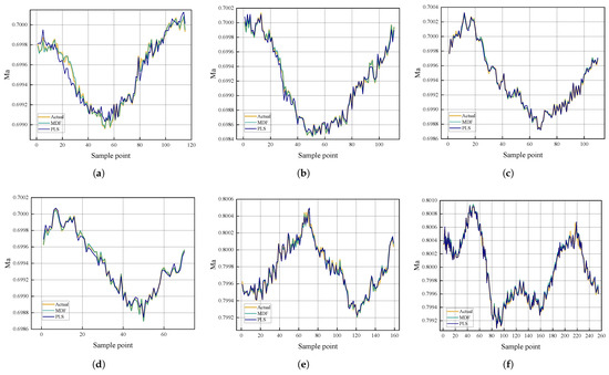 Comparison of prediction performance between MDF and PLS: (a) operating condition 1, (b) operating condition 2, (c) operating condition 3, (d) operating condition 4, (e) operating condition 12, and (f) operating condition 13.