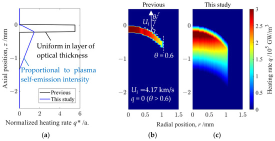 (a) Normalized axial heating rate q*(r) in a previous study (black line) and in this study (blue line). The value is normalized so that the integral value is equal to the unit heating rate [W/m2]. To obtain the absolute distribution q(r,z), it is multiplied by ηS(r) (Equation (3)). (b) Input q(r,z) in the CFD of the previous study. q*(r) was given by (a) and axially uniform in the layer of optical thickness. The white arrows indicate the propagation direction of the heating region in the simulation. θ represents the angle of the wavefront relative to the propagation direction, and heating does not input in the region where cos θ is larger than 0.6. (c) Input q(r,z) in the CFD of this study. q*(r) is given by (a) as proportional to the measured self-emission intensity distribution. The other conditions are the same as (b).