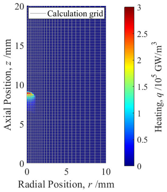The computational domain and the grid size of the CFD simulation. The grid is represented by gray lines, and the size is the case of ∆r = ∆z = 200 μm on the axis, which is the coarsest setting. The heating distribution is shown in the colormap, and the heating region propagates upward at a speed determined by Equation (2). The left side is an axisymmetric boundary, and the other boundaries are outflow boundaries.