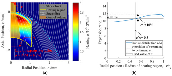 To determine which streamline should be used for the Hugoniot analysis, Figure 4b shows the distribution of the value of σ depending on the position of the streamline through the end of the control volume. The horizontal axis is the relative position normalized by the radius of the heating region. The difference from the value at the central axis is as much as 10% at r/ri = 0.5 and as much as 20% at r/ri = 1. σ is obtained from the streamlines passing through the r/ri = 0.5 position so that the error in the back pressure evaluation is within 10% because of the error in σ. In this example, σ = 10.6; also, in Figure 4a, the used streamline to obtain σ is shown as the outline of the control volume.