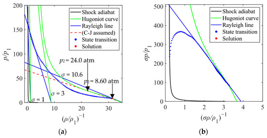 (a) The Hugoniot diagram of LSD. The Hugoniot curve (green line) is drawn by application of σ2 to Equation (9). The Rayleigh line (blue lines) drawn by Equation (8) moves to the right as σ increases. (b) The Hugoniot diagram has axes normalized by the changing expansion ratio σ to remove effects of expansion from the diagram. The gas state (blue dots) always transitions along a fixed Rayleigh line (blue solid line) drawn as a fit line of the dots of the state transition, which is similar to a one-dimensional Hugoniot diagram.