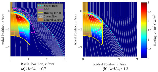 This section presents an examination of the range of conditions under which the conclusions of the analysis remain valid. First, because the propagation velocity of LSD is known to vary depending on the atmospheric conditions [26,27,28], the calculation results are presented in Figure 7 for the same heating input with the changed propagation velocity. If Speak > 200 GW/m2, then LSD propagates faster in helium and slower in argon [27]. Figure 7a was input 30% faster than Matsui’s measurement; Figure 7b was input 30% slower. The axial coordinate system is fixed relative to the front of the heating region, allowing a comparison of the shock wave and sonic surface positions.