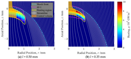 Input heating W and result for position of shock front, sonic surface, and streamlines shown in coordinate system fixed in the front of heating region. The color maps show the input heating and distribution. The axial lengths of heating region l are (a) 0.50 mm and (b) 0.35 mm.