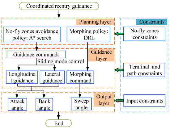 Inspired by the above research, an intelligent coordinated reentry guidance method based on the A* search algorithm and RL is proposed. The intelligent coordinated reentry guidance scheme is shown in Figure 1, and the framework of the reentry guidance is divided into three layers: the planning layer, guidance layer, and output layer. The planning layer includes two tasks. One is to plan the waypoints under multiple no-fly zones through the A* search algorithm and obtain an avoidance policy. The other is learning the morphing policy based on the RL algorithm to obtain the morphing command under different flight states. By combining the A* algorithm with DRL, utilizing A* to tackle the no-fly zone issues and employing DRL for morphing control, we can specifically address the trajectory planning and guidance problems of HMVs under no-fly zone conditions, enhancing the efficiency of online intelligent guidance. The guidance layer receives the waypoints and morphing command from the planning layer and calculates the longitudinal and lateral guidance inputs through the QEGC guidance law by the sliding mode control method. In the output layer, the guidance control input and the morphing command are solved jointly to obtain the corresponding angle of attack, bank angle, and sweep angle, and the input constraints are added to complete the coordinated reentry guidance for the HMV with no-fly zones. The main contributions of this paper are as follows: