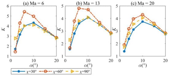 The effects of morphing on the longitudinal aerodynamic coefficient of the HMV in our research are shown in Figure 3, where K is the lift-to-drag ratio. It can be seen that the morphing can significantly change the drag coefficient, lift coefficient, and lift-to-drag ratio of the HMV at a different velocity, so the aerodynamic characteristics of the HMV can be changed by adjusting the sweep angle to achieve the optimal aerodynamic performance to meet the current flight requirements.