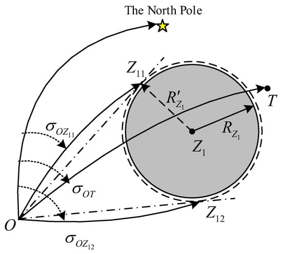 where is the safety factor; and are the two points of tangency with respect to the safety radius of the no-fly circle ; , , and are the azimuthal angles of the trajectory , , and , respectively; and the azimuthal angle is expressed as