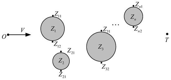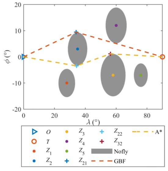 As shown in Figure 5, for the avoidance flight problem under multiple no-fly zones, the HMV starts from the initial position and searches for the next feasible waypoint in the known graph at each current waypoint, so that the flight trajectory can avoid all no-fly zones until it reaches the target position. Finally, the avoidance trajectory with an optimal objective function is obtained. The A* algorithm performs a heuristic search by the evaluation function, which is set to estimate the cost that the current waypoint needs to spend to reach the target. The evaluation function is designed as follows: