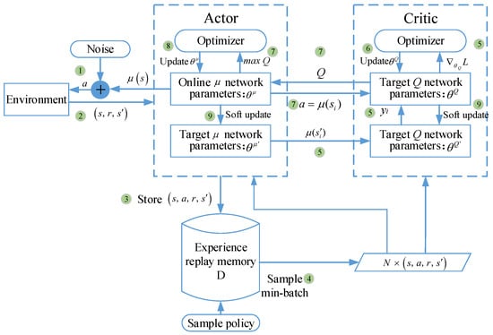 - Silver, D.; Lever, G.; Heess, N.; Degris, T.; Wierstra, D.; Riedmiller, M. Deterministic Policy Gradient Algorithms. In Proceedings of the 31st International Conference on International Conference on Machine Learning-Volume 32, Bejing, China, 21–26 June 2014; JMLR.org: Beijing, China, 2014; pp. I-387–I-395. [Google Scholar]