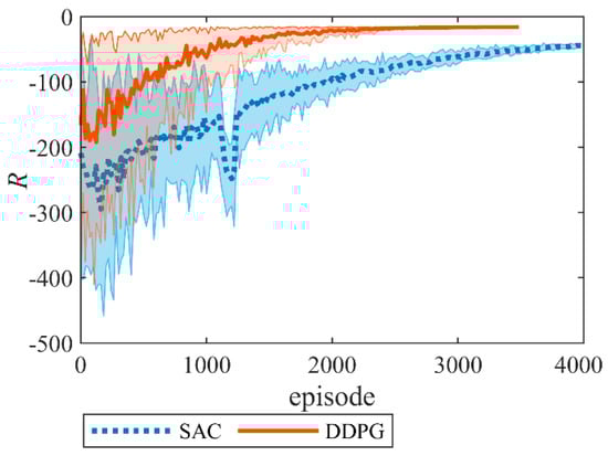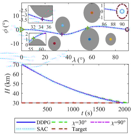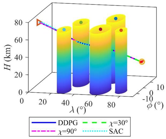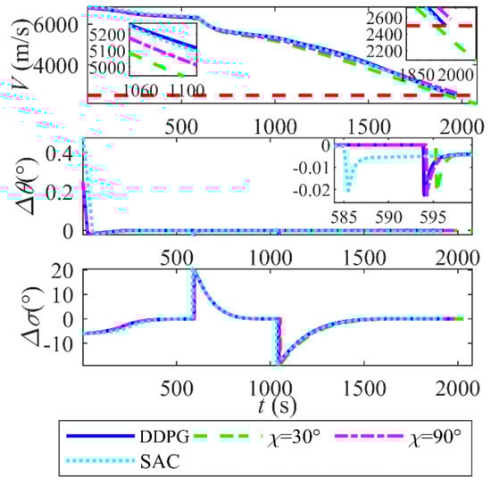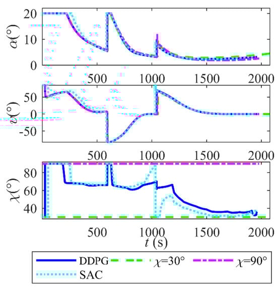 Following 3600 episodes of RL training for coordinated reentry guidance, the cumulative rewards trajectory is visualized in Figure 8, where the deterministic policy gradient-based DDPG algorithm is benchmarked against soft Actor–Critic (SAC) algorithm [] to evaluate their control performance. As depicted in Figure 3, the DDPG algorithm demonstrates superior convergence velocity and stability metrics compared to its SAC counterpart. Quantitatively, the reward function of the DDPG framework progressively converges to a stabilized maximum value of approximately −16, whereas the SAC algorithm plateaus at a significantly lower reward magnitude of −43. This substantial performance disparity indicates that the morphing policy network instantiated by the DDPG algorithm achieves an optimal mission-specific parameterization.