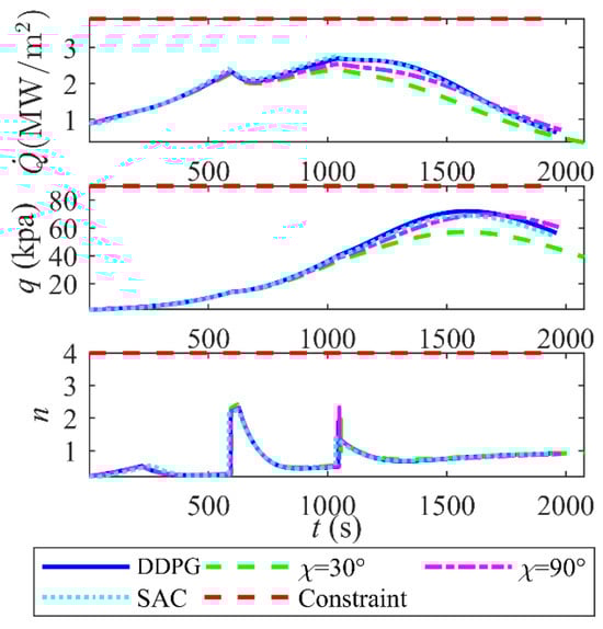 According to Figure 12, the angles of attack and bank angles under the three morphing policies are within the constraints of the control inputs and maintain the QEGC gliding flight in the longitudinal and lateral directions. Compared with the two fixed morphing groups, the sweep angle of the DDPG morphing policy is relatively more complex. The sweep angle will be kept at 30° to increase the lift to achieve upward tracking under the large positive tracking error. Otherwise, the sweep angle will be kept at 90° to decrease the lift to achieve downward tracking. During the avoidance flight with no-fly zones, the sweep angle is kept near the optimal sweep angle corresponding to the maximum lift-to-drag ratio, so as to increase the lift-to-drag ratio, reduce the velocity loss during the avoidance flight, and retain more energy for the subsequent mission. Figure 13 shows that the constraints of heat rate density, dynamic pressure, and overload are all kept below the corresponding constraints to keep a safe reentry flight.