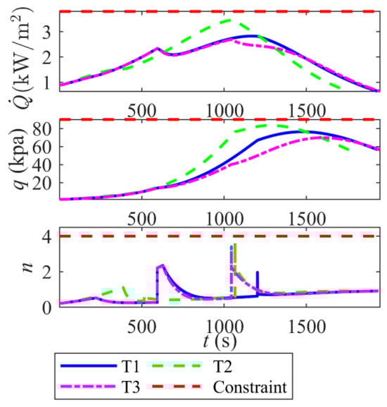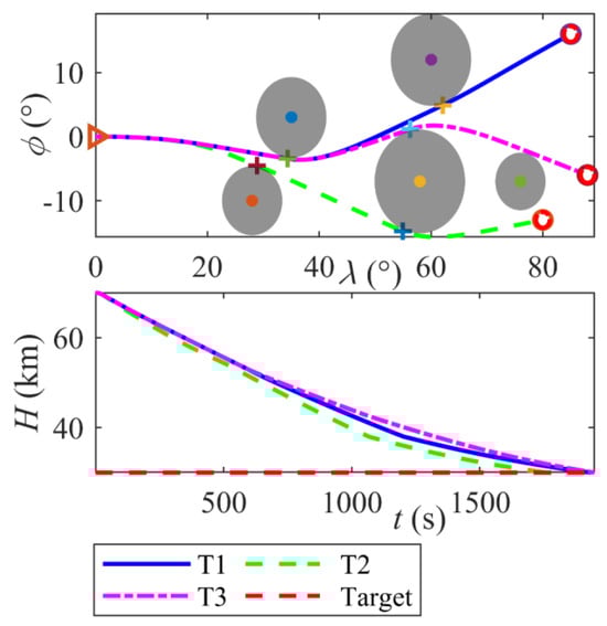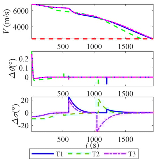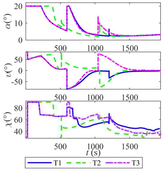 The above simulation results are trained for a single mission, and in order to check the results of the generalization of the intelligent coordinated guidance method for different missions, other flight targets different from the training mission are given for simulations. Three different groups of target positions are set as T1 (85°, 16°), T2 (80°, −13°), and T3 (88°, −6°). Figure 14 shows that the proposed coordinated guidance method presents a good generalization performance and guides the HMV from the starting point to the TAEM interface of different targets without crossing the multiple no-fly zones. The terminal position and no-fly zone constraints are satisfied. The terminal position errors of T1, T2, and T3 are −0.21 km, −0.24 km, and −0.09 km, respectively. As shown in Figure 15, in three different flight targets, the terminal velocity errors are 5.90 m/s, 1.74 m/s, and 3.67 m/s, which are within the allowed range. This adherence to the allowed range indicates that the DDPG morphing policy can effectively constrain the terminal velocity. The tracking of the velocity bank angle, as well as the heading angle, satisfy the heading angle constraint. From Figure 16, it can be seen that the changes to the angle of attack and bank angle under the three different flight targets are within the input constraints. The DDPG morphing policy can cope well, making an autonomous adjustment to the sweep angle according to the flight missions. Figure 17 demonstrates that the path constraints are satisfied under the three different flight targets.