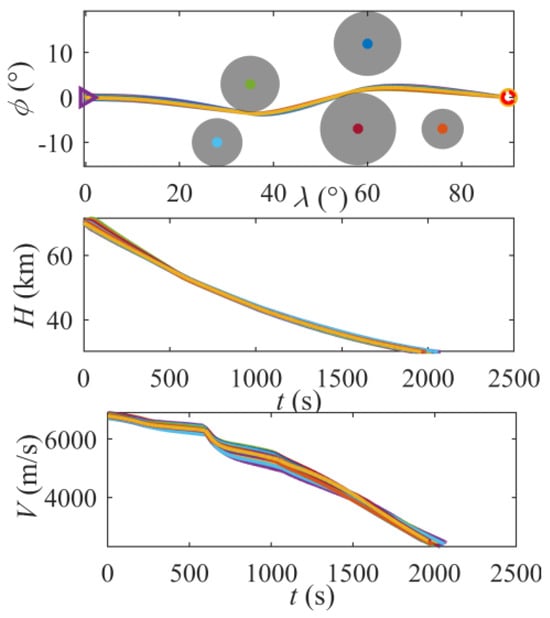 From the effect of morphing on the aerodynamic characteristics of the vehicle in Section 2.3, the regulation of morphing on the guidance performance is reflected in the following three aspects: (1) by adjusting the drag coefficient through morphing, it is possible to adjust the velocity loss and thus satisfy the terminal velocity constraint; (2) by adjusting the lift coefficient through morphing, the longitudinal motion control can be adjusted, thus improving the tracking performance of the flightpath angle; (3) adjusting the lift-to-drag ratio by morphing is similar to adjusting the drag coefficient, which can adjust the energy loss during flight and realize the optimization of velocity or range.