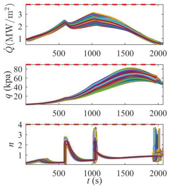 The obtained trajectories and velocities of the 1000 Monte Carlo experiments are shown in Figure 18. The results show that the designed intelligent coordinated guidance method can accomplish the reentry of the mission with no-fly zones under the deviations of the initial state, atmospheric density, and aerodynamic coefficient. The statistics of terminal position and velocity of the Monte Carlo experiments are presented in Figure 19. The mean value of terminal range error is 0.263 km, and the standard deviation is 0.184 km, while the mean value of terminal velocity error is −12.7 m/s, and the standard deviation is 42.93 m/s. Therefore, the errors of terminal range and velocity are within the allowed range, providing clear visual evidence of the method’s resilience to sensor noise, actuator delays, and parameter uncertainties in the reentry flight. Figure 20 shows the sweep angle variation curve with time delay. Figure 21 shows that the path constraints and flight safety are satisfied in Monte Carlo experiments.