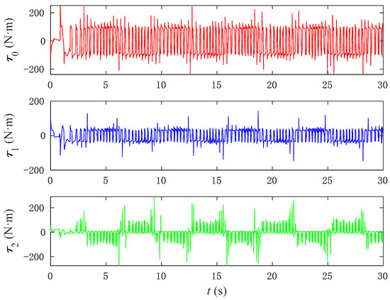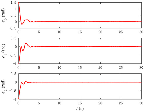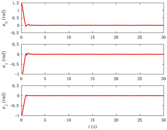 Figure 6 illustrates the error conditions corresponding to the three joint angles. Based on the simulation results, it can be observed that, although the tracking errors of the three joint angles are small and eventually converge to a subset near zero, noticeable fluctuations still occur, particularly with significant error variation within the 0–3 s interval. From