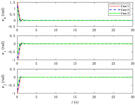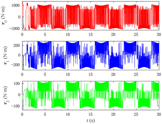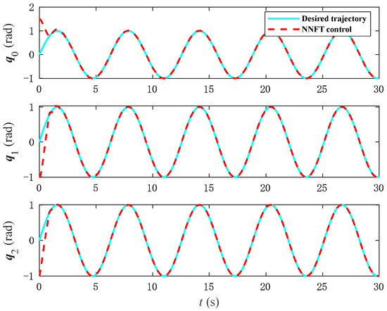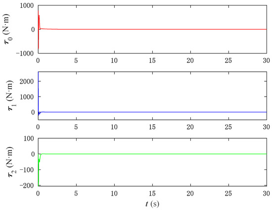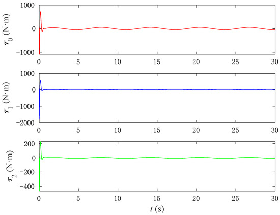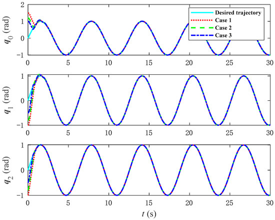 The initial state of the system is as follows: , , and ; the second initial value is the following: , , and ; the third initial value is the following: , , and . The desired trajectory of the configuration is the following: , , and . The simulation time is taken as 30 s.