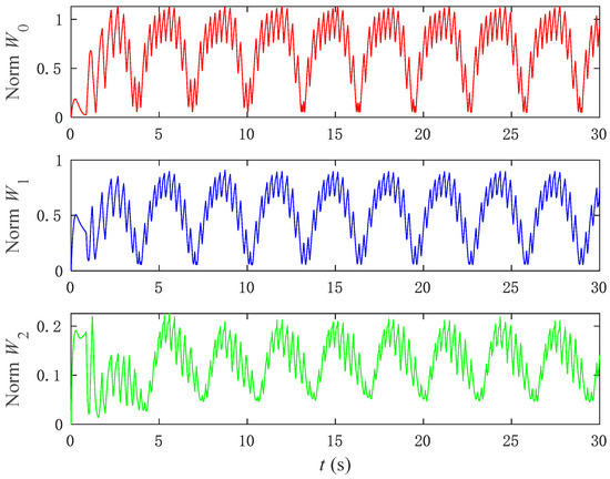 Figure 10 shows the process of updating the weights of the neural network. As can be observed, the neural network’s weights converge over time within a bound, demonstrating the ability of the neural network to compensate for the input dead zone and approximate the unknown dynamics of the system.