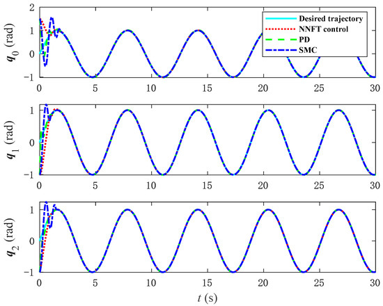 Figure 13 presents a comparative plot of joint angle trajectory tracking under three control methods, while