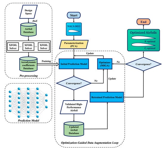 The following subsections provide a detailed description of the surrogate model based on optimization-guided data augmentation loop for predicting aerodynamic coefficients of airfoils, as well as the optimization algorithm for airfoil design.