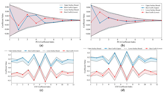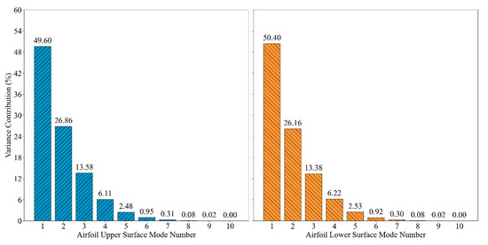As shown in Figure 5, the cumulative contribution of the first nine principal modes reaches 100% for both the upper and lower surfaces of the airfoil. This indicates that these nine modes are sufficient to fully represent the original geometric space. From the perspective of dimensionality reduction, when the goal is to preserve complete shape information, the PCA-based parameterization method reduces the number of design variables required to describe a single airfoil surface from 12 to 9. This represents a reduction in dimensionality compared to the CST parameterization approach.