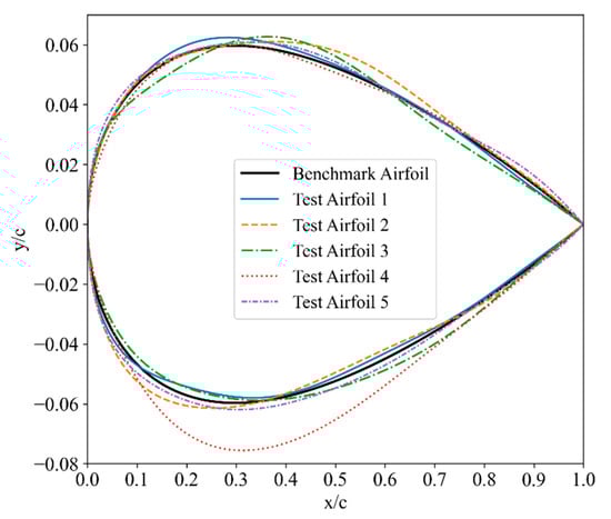 Five airfoils were randomly resampled from the design space and used as test airfoils for fitting accuracy and error analysis. Figure 6 illustrates the shapes of these test airfoils, where c represents the airfoil’s chord length, x denotes the coordinate along the chord direction, and y represents the coordinate along the thickness direction. The horizontal axis corresponds to the normalized chordwise position, while the vertical axis corresponds to the normalized thickness distribution.