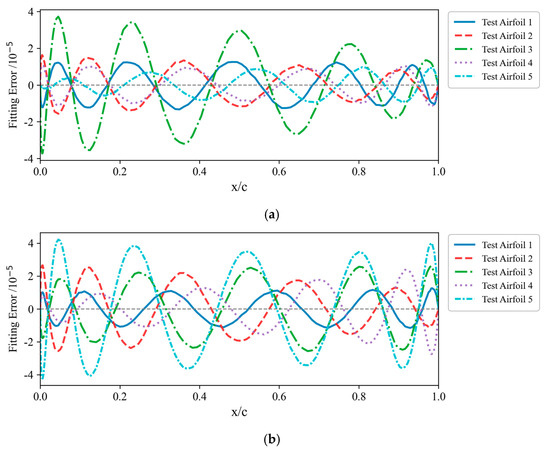 In the equation, F(α) denotes the reconstructed airfoil grid point data obtained through the fitting procedure. The variable represents the actual grid point data of the airfoil being fitted. The objective function defined in Equation (22) quantifies the fitting accuracy. Figure 7 shows the variation of the fitting accuracy of the test airfoils with the number of principal modes. Figure 8 presents the fitting error between the actual and fitted data for the upper surface of the test airfoils when the first nine modes are used for characterization. In this paper, the fitting accuracy is defined as the sum of the squared differences between the fitted data and the actual data across all grid points. This measure is cumulative. The fitting error refers to the individual difference at each grid point between the actual and reconstructed data. This value is evaluated at a single point.