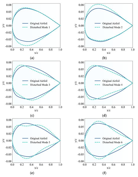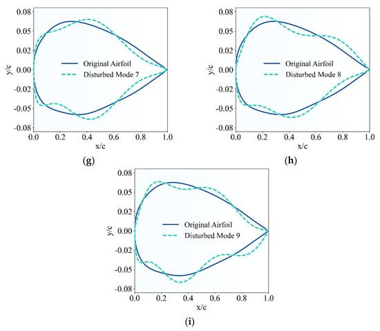 To analyze the effect of each mode on the geometric shape, using test airfoil 1 as an example, the coefficients corresponding to each of the first nine modes were perturbed during the fitting process (upper surface coefficients were increased by 0.1, and lower surface coefficients were decreased by 0.1). Figure 9 shows the results after perturbing each mode.