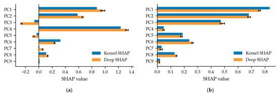 Attribution consistency analysis between Deep SHAP and Kernel SHAP: (a) for K prediction and (b) for CL prediction.