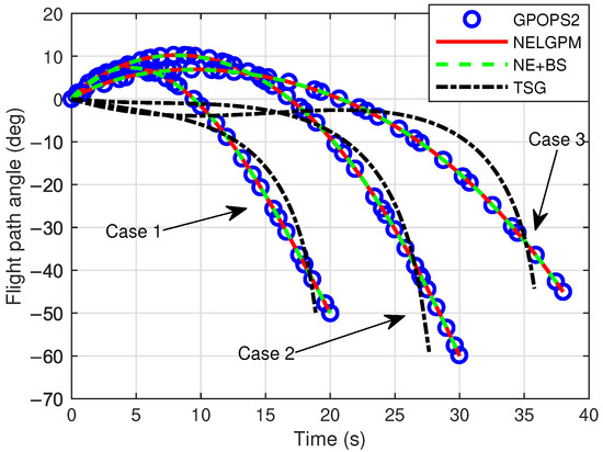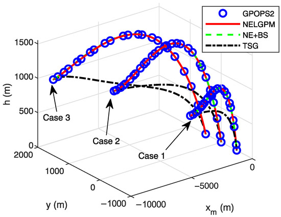 The proposed method was applied to the guidance problem of air-to-ground aircraft. This problem is an OCP with fixed terminal time and terminal constraints. In order to verify the adaptability of the proposed method in different situations, three distinct simulation scenarios were chosen, each sharing identical initial conditions but with different initial state deviations and terminal constraints. Furthermore, the simulation results obtained through the proposed method were compared with those from GPOPS-II, neighboring extremal with backward sweep method (NE + BS), and trajectory shaping guidance (TSG) [47,48]. GPOPS-II, a widely used offline pseudospectral optimization software utilizing the Radau pseudospectral method, served as a benchmark to assess the optimality of the proposed method. The backward sweep method is a classical method for solving the neighboring extremal optimal problem, used to compare and verify the computational efficiency of the proposed method. TSG, a classical terminal guidance law, was employed to ensure angular constraints while guiding the aircraft to the target. All simulations in this paper were carried out in MATLAB R2023b using an AMD Ryzen 7 5800X processor.