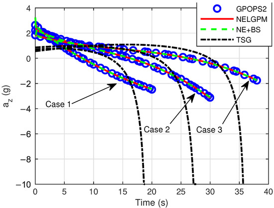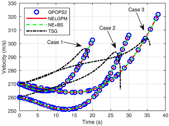 In order to solve the nonlinear OCP online, Padhi et al. proposed a method for solving finite-time nonlinear OCPs with terminal constraints, known as model predictive static programming (MPSP), combining the idea of nonlinear model predictive control (MPC) and approximate dynamic programming [26]. This method predicts terminal errors through numerical integration and discretization dynamics using the Euler integration. It has been successfully applied to many problems in the aerospace field [27,28]. However, this approach requires a large number of nodes to ensure the computational accuracy, which leads to low computational efficiency. Yang et al. also proposed a linear Gauss pseudospectral model predictive control method (LGPMPC) on the framework of MPC, which can solve the nonlinear OCP with fixed time [29]. In comparison with MPSP, this method employs orthogonal collocation points, requiring fewer nodes for the same accuracy, and only needs to solve linear algebraic equations through linearization, which has higher computational efficiency and can be applied online. This method has also been developed and applied in various scenarios such as reentry guidance [30] and long-term air-to-air missile guidance [31,32]. Also, scholars use a pseudospectral discretization strategy to reduce the requirement of the number of nodes for MPSP [33]. However, both of the above methods require a performance index in the form of linear quadratic, and their costate variables are not the same as those of the original OCP. Therefore, they cannot solve OCPs with arbitrary performance indices or provide the costate variables of the original problem.