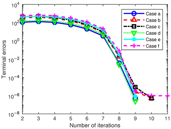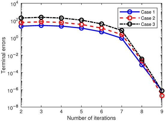 Next, the convergence process was analyzed through simulation results. The terminal error is a scalar value, which is the 2-norm of different terminal state errors including position and angle. Figure 8 shows the history of the terminal errors varying with the number of iterations. It can be observed that the convergence rate is notably slow during the initial iterations. As the neighboring optimal solutions gradually converge towards the global optimum, the iteration speed increases significantly. For all cases, it only takes nine iterations to reach the designated tolerance. Hence, the proposed method exhibits a remarkably high convergence speed.