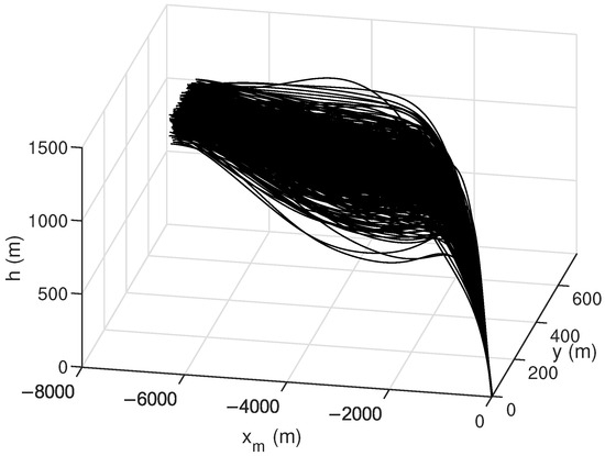 Finally, Monte Carlo simulations were carried out to verify the robustness of the proposed method. Simulation conditions were the same as those in Case 2. Uncertainties in atmospheric density and aerodynamic coefficients in actual aircraft flight operations were considered in the simulation. These uncertainties involved initial state variables, atmospheric density, and aerodynamic coefficients. The deviations in initial state variables followed both uniform and Gaussian distributions, while deviations in atmospheric density and aerodynamic coefficients followed Gaussian distributions, with specific parameter distributions outlined in Table 9. The results of 500 Monte Carlo simulations are shown in Figure 10, Figure 11 and Figure 12. The terminal errors are summarized in Table 10.