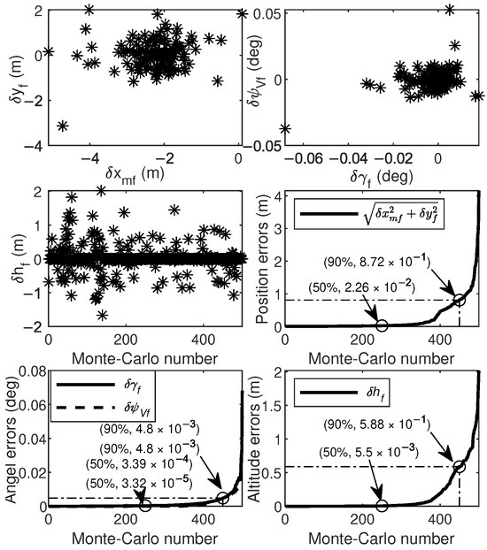 Figure 10 shows the flight trajectory from the Monte Carlo simulations. It is evident that the proposed method performs well in guiding the aircraft towards the specified target, even under various random perturbation conditions. Figure 11 shows the control histories from the Monte Carlo simulation results. Notably, the proposed method provides stable and smooth control commands for all cases, which is beneficial for practical applications. Figure 12 shows the terminal errors from Monte Carlo simulations. It is evident that the maximum terminal position error is within 5 m, and the maximum terminal angle error is within 0.1 degrees.