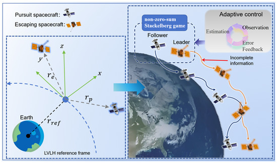 A significant challenge in PE games is the inherent asymmetry of information and the sequential nature of decision making. Most traditional game–theoretic solutions are based on the Nash Equilibrium (NE), which assumes that players act simultaneously with full knowledge of each other’s strategies [20]. This assumption is often invalid in practice, as information gathering and decision making involve inherent time lags. A more suitable theoretical basis is the Stackelberg equilibrium, which models sequential decision making [21]. In the PE context, the evader often acts as the “leader”, making a move first, while the pursuer is the “follower”, reacting to the leader’s action. Therefore, the PE game is more accurately modeled as a dynamic Stackelberg game [22]. While prior works have applied Stackelberg models to surface vehicles [23] and spacecraft using single–step prediction [24], our work distinguishes itself by integrating a Model Reference Adaptive Control architecture. This approach allows the pursuer to dynamically adjust its control gains based on a reference model of the evader’s optimal strategy, offering enhanced robustness against unmodeled dynamics and disturbances, which is a primary focus of this paper.
