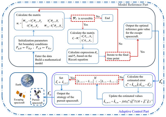 Figure 2 illustrates the overall control architecture. The process is divided into two main parts: the Model Reference Part and the Adaptive Control Part. In the Model Reference Part (top), the system calculates the optimal reference gain for the evader, . This involves initializing parameters, building the mathematical model, and iteratively solving the Riccati Equations (7) and (8) to compute the optimal strategies. The resulting optimal evader gain is then fed as a reference to the Adaptive Control Part (bottom). Here, the pursuer observes the system state and uses an adaptive law to update its own strategy to effectively track the evader’s behavior.