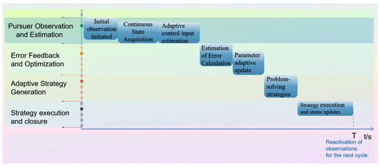 Figure 3 provides a timeline perspective of a single iteration cycle of the pursuer’s adaptive strategy generation. It begins with the ‘Pursuer Observation and Estimation’ phase, where the pursuer acquires the state of the evader. This is followed by ‘Error Feedback and Optimization’, where the error is calculated and parameters are updated based on the reference model. This leads to ‘Adaptive Strategy Generation’ and finally ‘Strategy execution and closure’. The cycle repeats, allowing for continuous adaptation.