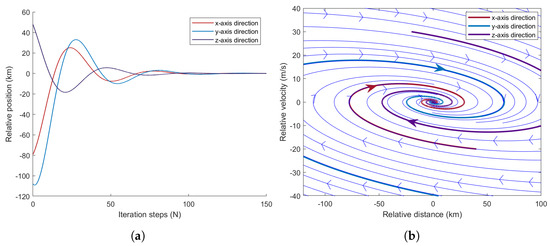 The law of the relative motion state of the Pursuit–Evasion spacecraft. (a) The law of variation of relative position with time steps. (b) Trajectory diagram of pursuit and evader.