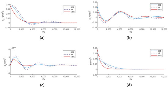 Acceleration changes of spacecraft under three strategies. (a) The law of variation of . (b) The law of variation of . (c) The law of variation of . (d) The law of variation in the magnitude of acceleration.