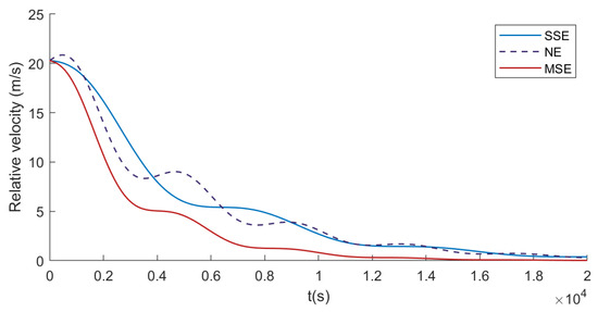 Figure 8 shows the relative velocity changes between the two spacecraft. Consistent with the pursuit efficiency shown in Figure 7, the MSE strategy achieves the fastest reduction in relative velocity, decreasing 10.47% faster than the SSE strategy in the initial 3000 s. This rapid decrease is crucial for a successful capture, as it allows the pursuer to quickly match the evader’s velocity vector and stabilize the relative dynamics.