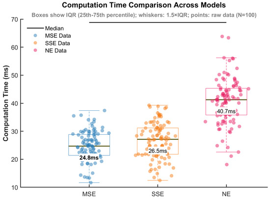 Figure 9 compares the computational time distributions of SSE, NE, MSE, and MPC, based on 100 Monte Carlo trials for each scenario. The boxplot shows that the median time (24.79 ms) of MSE is 7.36% and 39.11% lower than that of SSE (26.75 ms) and NE (40.7 ms), respectively, and the variance is smaller (MSE standard deviation 0.452 vs. 0.804 for NE), indicating its computational efficiency and stability advantages.