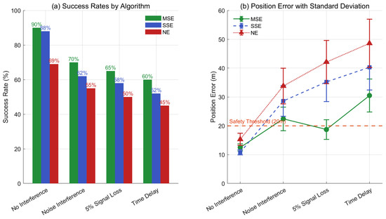Figure 10a compares the success rates of the three algorithms under different interference conditions. In the ‘No Interference’ case, the MSE algorithm achieves a lower success rate than the SSE algorithm. This result stems from the adaptive control mechanism of MSE, which continuously updates its parameters, while SSE relies on predictive optimization. MSE demonstrates stronger robustness, maintaining high performance under noise interference and signal loss, whereas NE and SSE exhibit significant performance degradation. Figure 10b analyzes the position error with standard deviation. MSE consistently satisfies the 20% safety threshold across all interference scenarios, including noise and signal loss. In contrast, NE and SSE show higher error variability, particularly under time delays. These results confirm the reliability of MSE in disturbance–prone environments.