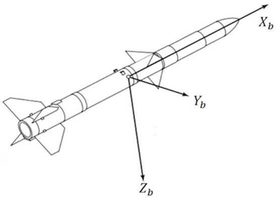 This study focuses on a typical missile configuration (Figure 1), comprising a fuselage, wings, and tail fins arranged in an “X” configuration. The missile features a body length of approximately 1.5 m and a diameter of about 0.2 m. The selected layout is relatively simple, yet shares comparable flight dynamic characteristics and control law design principles with many high-speed missile variants, thereby providing broad representativeness. Flight control is primarily achieved through combined deflections of the four tail fins (rudders), as follows: