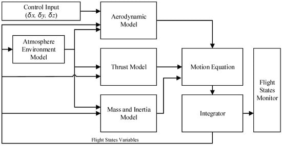 A flight dynamics model of the missile was developed using MATLAB Simulink R2023b (Figure 2). The inputs were the deflection angles of three tail fins ( δ x , δ y , and δ z ). The outputs included motion states such as position, velocity, acceleration, overload, attitude angles, angular rates, and angular accelerations. Within the model depicted in Figure 2, the following can be seen: