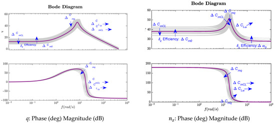 The above three key aerodynamic derivatives also had a significant impact on the frequency domain characteristics of the model. As shown in Figure 6, the Δ C m 0 parameter perturbation (representing the pitch control surface δ z efficiency error) induces proportional changes in the magnitude of the pitch rate q across the entire control input frequency spectrum. However, its effect on the normal load factor n z is primarily confined to the mid- to low-frequency range ( f < 100   Hz ). In contrast, the Δ α 0 perturbation (associated with variations in lift control surface efficiency) significantly affects the normal load factor n z response, but only in the high-frequency domain ( f > 50   Hz ).