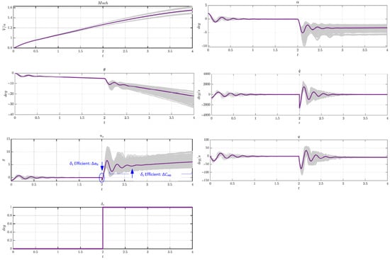 The above analysis is based on the linearized missile dynamics model. To further validate the findings, simulations and analyses were also conducted using the nonlinear missile dynamics model developed in Section 2.1. At the beginning of the simulation ( t = 0 s ), an initial angle of attack α = 2 ° is introduced to excite the system under zero control input. Once the system converges and stabilizes, a step input of δ z = 1 ° is applied at t = 2 s . Figure 9 illustrates the longitudinal open-loop response of the nominal missile model (in purple) and the variation range induced by aerodynamic parameter deviations (in gray). The model exhibits strong inherent stability, with both zero-input responses and responses to control surface disturbances decaying to near zero within 1 s.