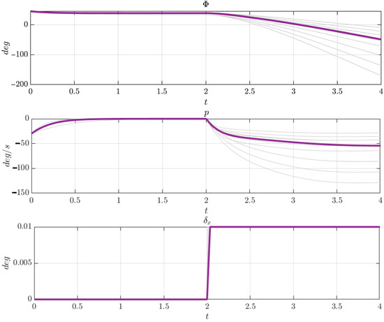 Figure 10. Open-loop roll response of the missile and the associated error bands induced by aerodynamic parameter deviations.